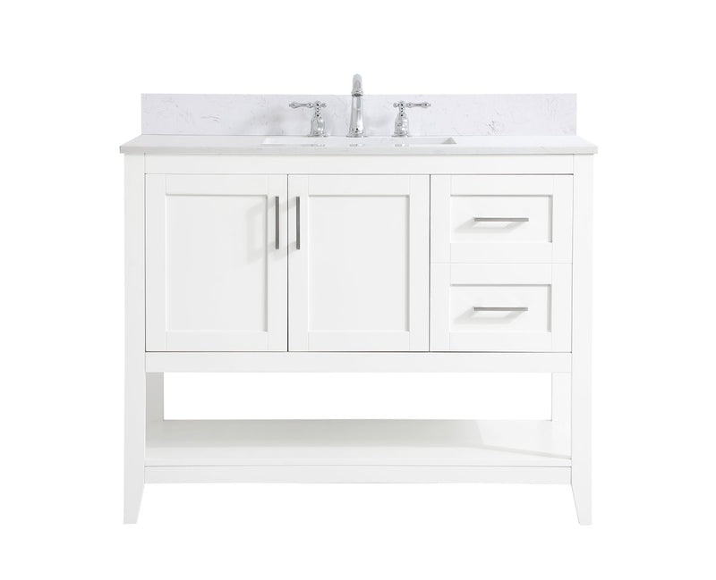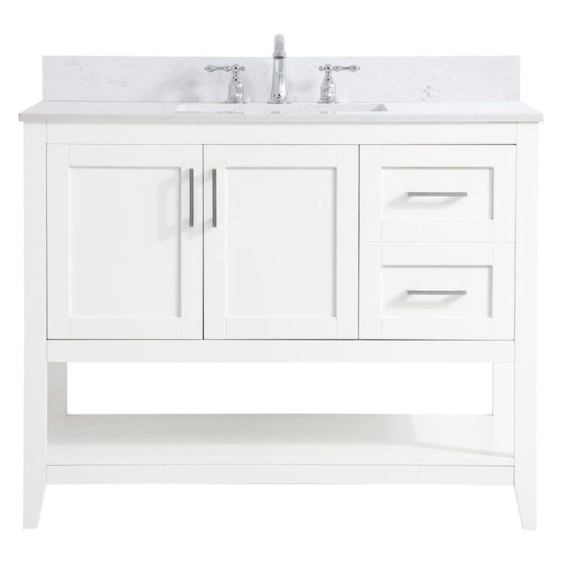 The nonchalant attitude of this 42" traditional white finish vanity will have you wanting more. The slender brushed nickel handle bars open the 3 cabinet doors to reveal ample storage space to put away and store bathroom essentials, and the open space below allows for you to place clean towels on the rack. Topped with a Calacatta quartz countertop, you and your guests will enjoy this easy going vanity. Comes with a matching backsplash to complete the look and protects your wall.