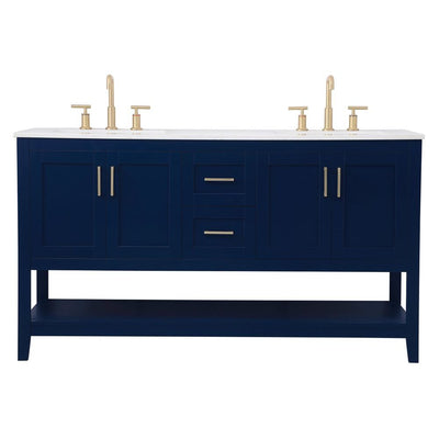 The nonchalant attitude of this 60" traditional Blue finish vanity will have you wanting more. The slender gold handle bars open the two double cabinet doors and two center drawers to reveal ample storage space to put away and store bathroom essentials, and the open space below allows for you to place clean towels on the rack. Topped with a Calacatta quartz countertop and double porcelain undermount sink, you and your guests will enjoy this easy going vanity.