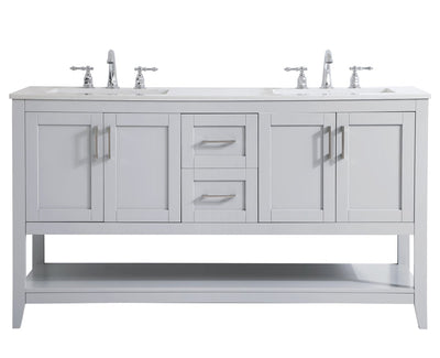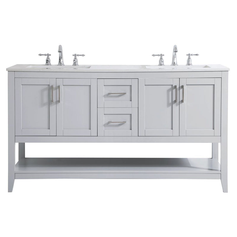The nonchalant attitude of this 60" traditional grey finish vanity will have you wanting more. The slender brushed nickel handle bars open the two double cabinet doors and two center drawers to reveal ample storage space to put away and store bathroom essentials, and the open space below allows for you to place clean towels on the rack. Topped with a Calacatta quartz countertop and double porcelain undermount sink, you and your guests will enjoy this easy going vanity.
