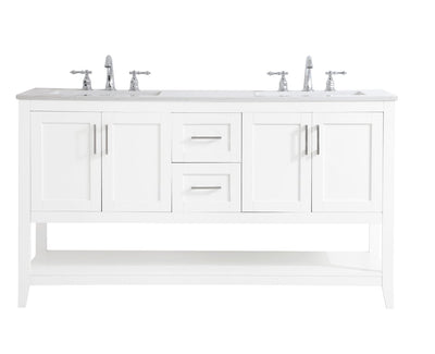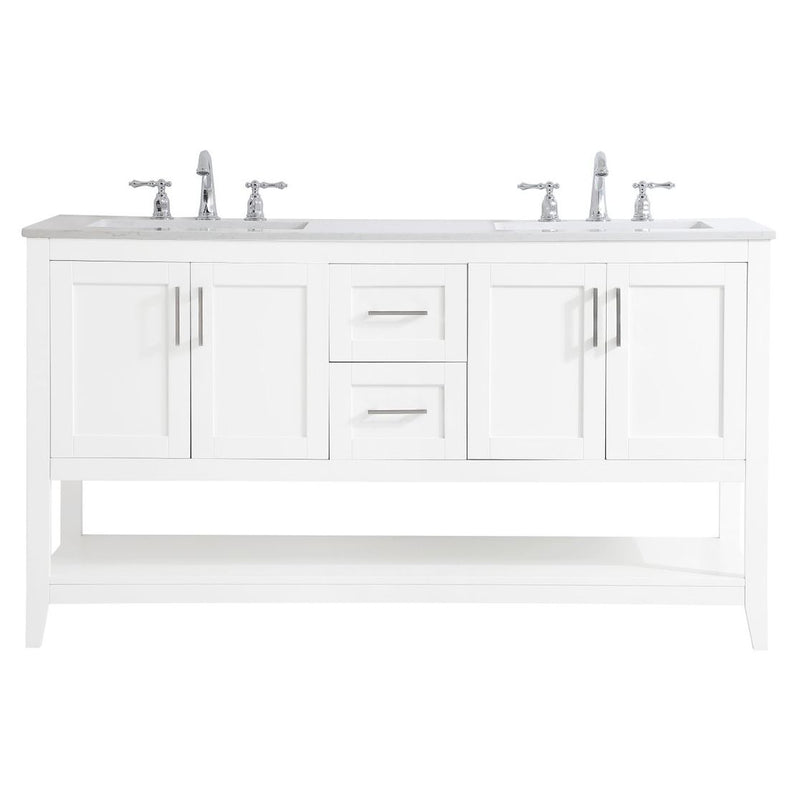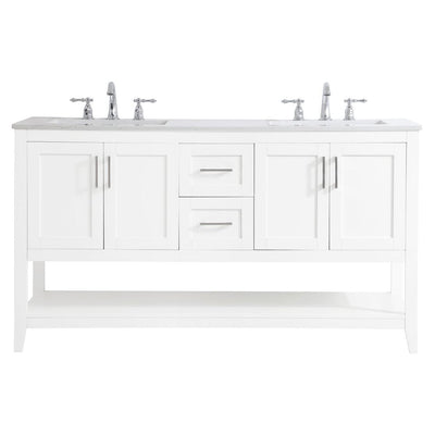 The nonchalant attitude of this 60" traditional white finish vanity will have you wanting more. The slender brushed nickel handle bars open the two double cabinet doors and two center drawers to reveal ample storage space to put away and store bathroom essentials, and the open space below allows for you to place clean towels on the rack. Topped with a Calacatta quartz countertop and double porcelain undermount sink, you and your guests will enjoy this easy going vanity.