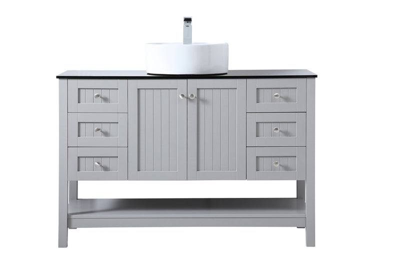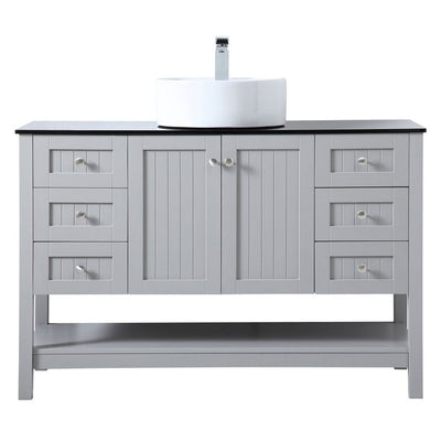 The refined simplicity of this 48" gray finish vanity creates a peaceful, yet stylish, atmosphere. Its traditional modernity adds a mature beauty that will elevate any bathroom or powder room--the tempured glass counter top with a round porcelain sink adds refined luxe while the brushed nickel knobs open the 2 cabinet doors, revealing ample storage space to store and hide away an assortment of bathroom essentials. Whether your home is large or small, this vanity will surely fit in well.