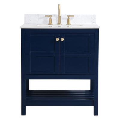 The subtle beauty of the Theo collection 30" vanity in a blue finish exudes comfortable luxury. Its modern, yet traditional beauty will surely dress up your bathroom or powder room without any fuss. The white stone countertop and porcelain undermount sink shows quiet opulence, and the legs support upright without fail. Gold hardware complements the trendy blue finish, with pulls adorning the two cabinet doors, showcasing ample storage space within. Slated shelf allows for additional space to organize your towels. Whether this vanity is in your bathroom or for guests, its presence will surely elevate the aesthetics of your room. Comes with a matching backsplash to complete the look and protects your wall.