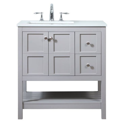 The subtle beauty of the Theo collection vanity exudes comfortable luxury. Its modern, yet traditional beauty will surely dress up your bathroom or powder room without any fuss. The calcatta quartz countertop and porcelain undermount sink shows quiet opulence, and the legs support upright without fail. Brushed nickel hardware complements the trendy gray finish, with pulls adorning the two cabinet doors, showcasing ample storage space within. Slated shelf allows for additional space to organize your towels. Whether this vanity is in your bathroom or for guests, its presence will surely elevate the aesthetics of your room.
