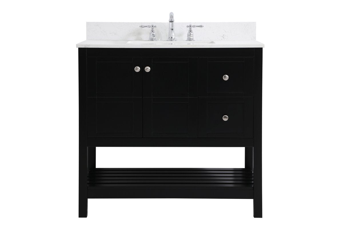 The subtle beauty of the Theo collection 36" vanity in a black finish exudes comfortable luxury. Its modern, yet traditional beauty will surely dress up your bathroom or powder room without any fuss. The white stone countertop and porcelain undermount sink shows quiet opulence, and the legs support upright without fail. Brushed Nickel hardware complements the trendy black finish, with pulls adorning the two cabinet doors and two drawers, showcasing ample storage space within. Slated shelf allows for additional space to organize your towels. Whether this vanity is in your bathroom or for guests, its presence will surely elevate the aesthetics of your room. Comes with a matching backsplash to complete the look and protects your wall.