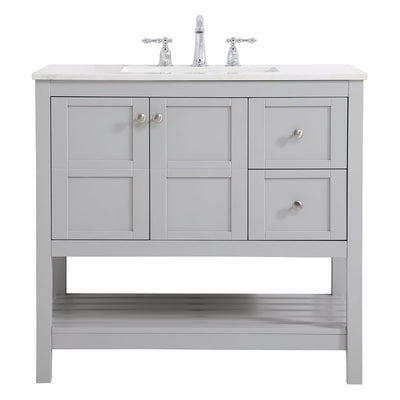 The subtle beauty of the Theo collection 36" vanity in a gray finish exudes comfortable luxury. Its modern, yet traditional beauty will surely dress up your bathroom or powder room without any fuss. The white stone countertop and porcelain undermount sink shows quiet opulence, and the legs support upright without fail. Brushed Nickel hardware complements the trendy gray finish, with pulls adorning the two cabinet doors and two drawers, showcasing ample storage space within. Slated shelf allows for additional space to organize your towels. Whether this vanity is in your bathroom or for guests, its presence will surely elevate the aesthetics of your room.