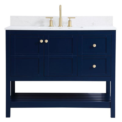 The subtle beauty of the Theo collection 42" vanity in a blue finish exudes comfortable luxury. Its modern, yet traditional beauty will surely dress up your bathroom or powder room without any fuss. The white stone countertop and porcelain undermount sink shows quiet opulence, and the legs support upright without fail. Gold hardware complements the trendy blue finish, with pulls adorning the two cabinet doors and two drawers, showcasing ample storage space within. Slated shelf allows for additional space to organize your towels. Whether this vanity is in your bathroom or for guests, its presence will surely elevate the aesthetics of your room. Comes with a matching backsplash to complete the look and protects your wall.
