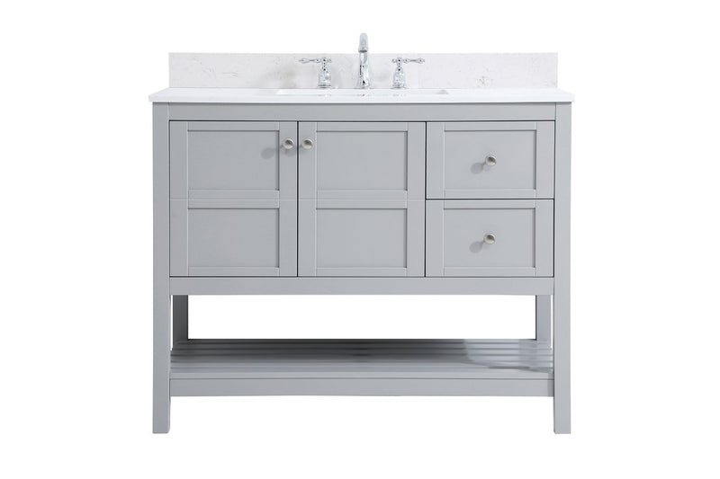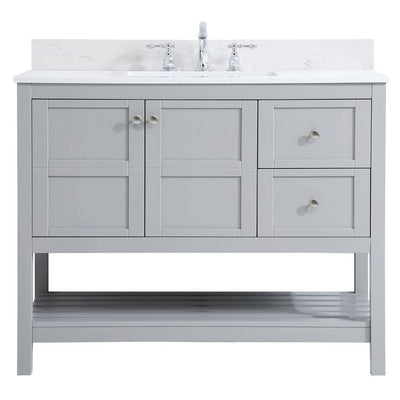 The subtle beauty of the Theo collection 42" vanity in a gray finish exudes comfortable luxury. Its modern, yet traditional beauty will surely dress up your bathroom or powder room without any fuss. The white stone countertop and porcelain undermount sink shows quiet opulence, and the legs support upright without fail. Brushed Nickel hardware complements the trendy gray finish, with pulls adorning the two cabinet doors and two drawers, showcasing ample storage space within. Slated shelf allows for additional space to organize your towels. Whether this vanity is in your bathroom or for guests, its presence will surely elevate the aesthetics of your room. Comes with a matching backsplash to complete the look and protects your wall.