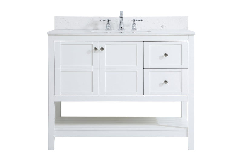 The subtle beauty of the Theo collection 42" vanity in a white finish exudes comfortable luxury. Its modern, yet traditional beauty will surely dress up your bathroom or powder room without any fuss. The white stone countertop and porcelain undermount sink shows quiet opulence, and the legs support upright without fail. Brushed Nickel hardware complements the trendy white finish, with pulls adorning the two cabinet doors and two drawers, showcasing ample storage space within. Slated shelf allows for additional space to organize your towels. Whether this vanity is in your bathroom or for guests, its presence will surely elevate the aesthetics of your room. Comes with a matching backsplash to complete the look and protects your wall.