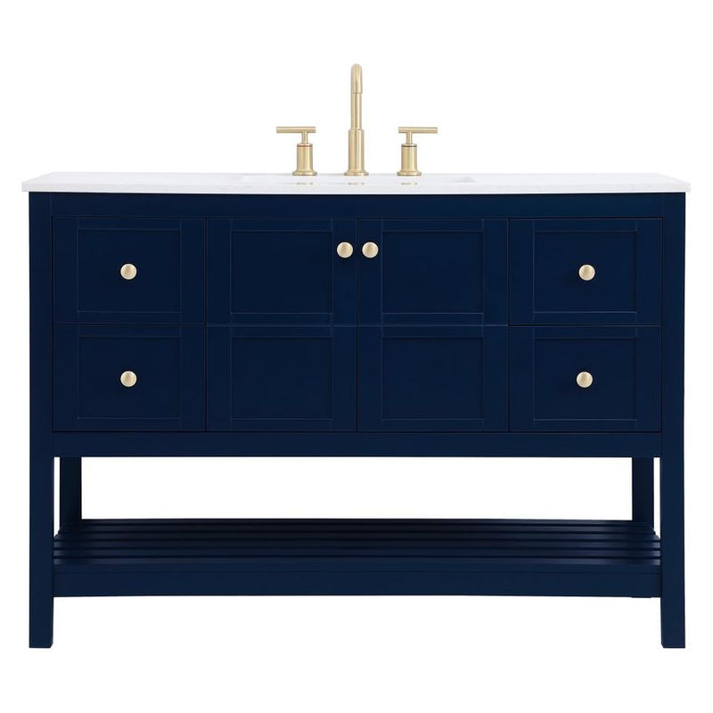 The subtle beauty of the Theo collection 48" vanity in a blue finish exudes comfortable luxury. Its modern, yet traditional beauty will surely dress up your bathroom or powder room without any fuss. The white stone countertop and porcelain undermount sink shows quiet opulence, and the legs support upright without fail. Gold hardware complements the trendy blue finish, with pulls adorning the two cabinet doors and four drawers, showcasing ample storage space within. Slated shelf allows for additional space to organize your towels. Whether this vanity is in your bathroom or for guests, its presence will surely elevate the aesthetics of your room.
