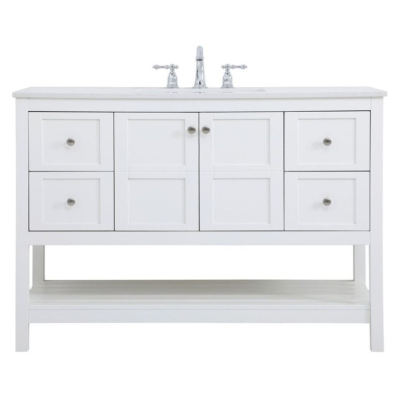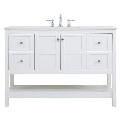The subtle beauty of the Theo collection 48" vanity in a white finish exudes comfortable luxury. Its modern, yet traditional beauty will surely dress up your bathroom or powder room without any fuss. The white stone countertop and porcelain undermount sink shows quiet opulence, and the legs support upright without fail. Brushed Nickel hardware complements the trendy white finish, with pulls adorning the two cabinet doors and four drawers, showcasing ample storage space within. Slated shelf allows for additional space to organize your towels. Whether this vanity is in your bathroom or for guests, its presence will surely elevate the aesthetics of your room.