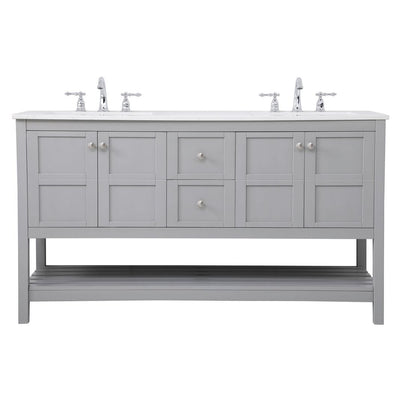 The subtle beauty of the Theo collection 60" vanity in a gray finish exudes comfortable luxury. Its modern, yet traditional beauty will surely dress up your bathroom or powder room without any fuss. The white stone countertop and porcelain undermount sink shows quiet opulence, and the legs support upright without fail. Brushed Nickel hardware complements the trendy gray finish, with pulls adorning the four cabinet doors and two drawers, showcasing ample storage space within. Slated shelf allows for additional space to organize your towels. Whether this vanity is in your bathroom or for guests, its presence will surely elevate the aesthetics of your room.