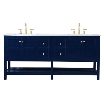 The subtle beauty of the Theo collection 72" vanity in a blue finish exudes comfortable luxury. Its modern, yet traditional beauty will surely dress up your bathroom or powder room without any fuss. The white stone countertop and porcelain undermount sink shows quiet opulence, and the legs support upright without fail. Gold hardware complements the trendy blue finish, with pulls adorning the four cabinet doors and four drawers, showcasing ample storage space within. Slated shelf allows for additional space to organize your towels. Whether this vanity is in your bathroom or for guests, its presence will surely elevate the aesthetics of your room.