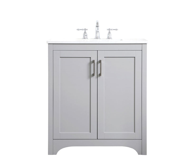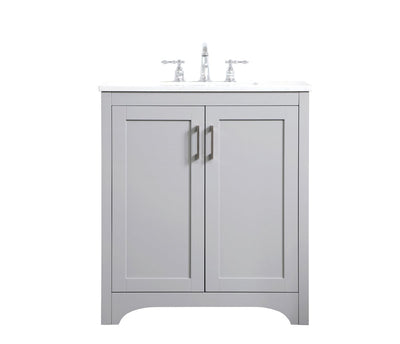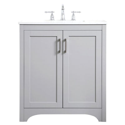 The refined simplicity of this 30" grey finish vanity creates a peaceful, yet stylish, atmosphere. Its traditional modernity adds a mature beauty that will elevate any bathroom or powder room--the Calacatta quartz counter top adds refined luxe while the brushed nickel handle bars open the two cabinet doors, revealing ample storage space to store and hide away an assortment of bathroom essentials. Whether your home is large or small, this vanity will surely fit in well.