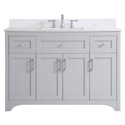 The refined simplicity of this 48" grey finish vanity creates a peaceful, yet stylish, atmosphere. Its traditional modernity adds a mature beauty that will elevate any bathroom or powder room--the Calacatta quartz counter top adds refined luxe while the brushed nickel handle bars open the 4 cabinet doors and 2 upper drawers, revealing ample storage space to store and hide away an assortment of bathroom essentials. Whether your home is large or small, this vanity will surely fit in well. Comes with a matching backsplash to complete the look and protects your wall.