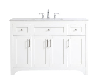 The refined simplicity of this 48" white finish vanity creates a peaceful, yet stylish, atmosphere. Its traditional modernity adds a mature beauty that will elevate any bathroom or powder room--the Calacatta quartz counter top adds refined luxe while the brushed nickel handle bars open the 4 cabinet doors and 2 upper drawers, revealing ample storage space to store and hide away an assortment of bathroom essentials. Whether your home is large or small, this vanity will surely fit in well.