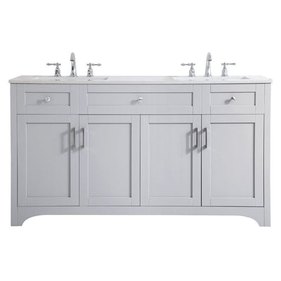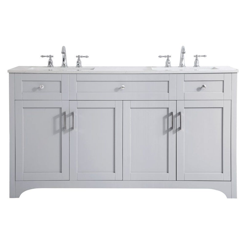 The refined simplicity of this 60" grey finish vanity creates a peaceful, yet stylish, atmosphere. Its traditional modernity adds a mature beauty that will elevate any bathroom or powder room--the Calacatta quartz counter top with double porcelain sinks add refined luxe while the brushed nickel handle bars open the 4 cabinet doors, revealing ample storage space to store and hide away an assortment of bathroom essentials. Whether your home is large or small, this vanity will surely fit in well.