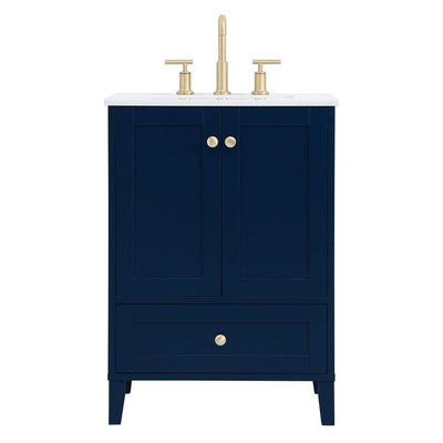 While unassuming, this 24" vanity in a Blue finish sure knows how to redefine luxury. The sleek gold knobs adorn the two cabinet doors and base drawer which allows you to store your bathroom toiletries and necessities. Standing strong on oblique legs and dressed with a Calcatta quartz countertop, this vanity will surely create beauty and casual elegance in your bathroom or powder room.