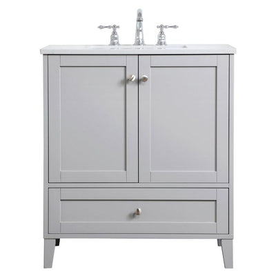 While unassuming, this 30" vanity in a grey finish sure knows how to redefine luxury. The sleek brushed nickel knobs adorn the two cabinet doors and base drawer which allows you to store your bathroom toiletries and necessities. Standing strong on oblique legs and dressed with a Calcatta quartz countertop, this vanity will surely create beauty and casual elegance in your bathroom or powder room.