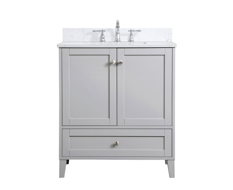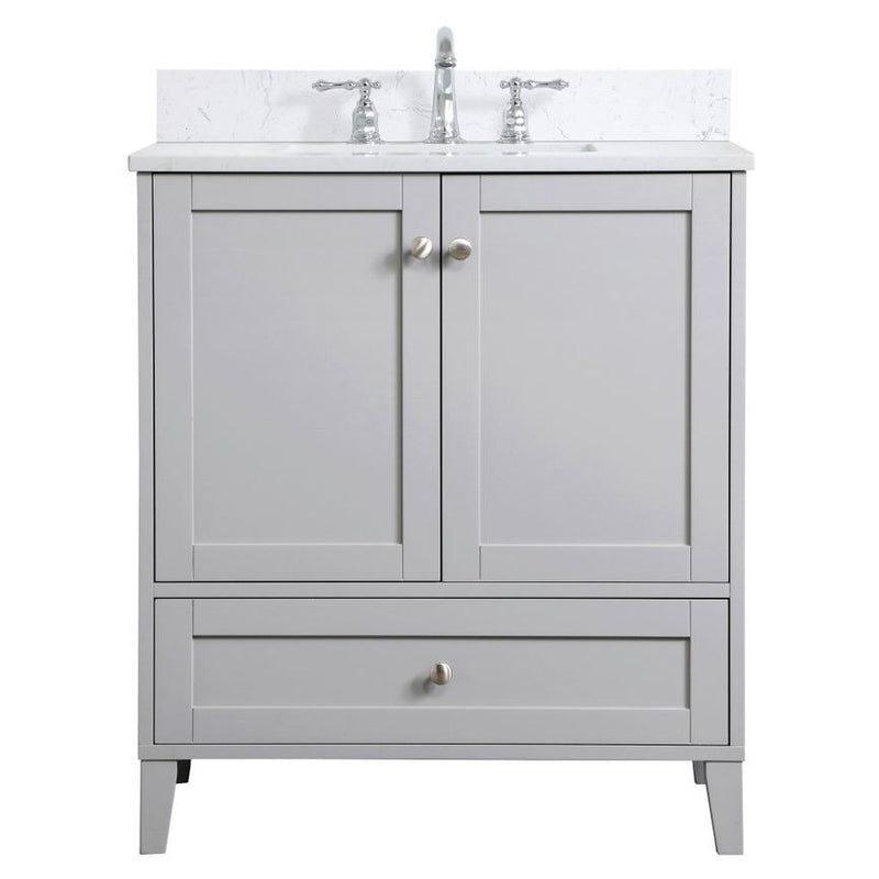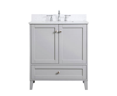 While unassuming, this 30" vanity in a grey finish sure knows how to redefine luxury. The sleek brushed nickel knobs adorn the two cabinet doors and base drawer which allows you to store your bathroom toiletries and necessities. Standing strong on oblique legs and dressed with a Calcatta quartz countertop, this vanity will surely create beauty and casual elegance in your bathroom or powder room. Comes with a matching backsplash to complete the look and protects your wall.