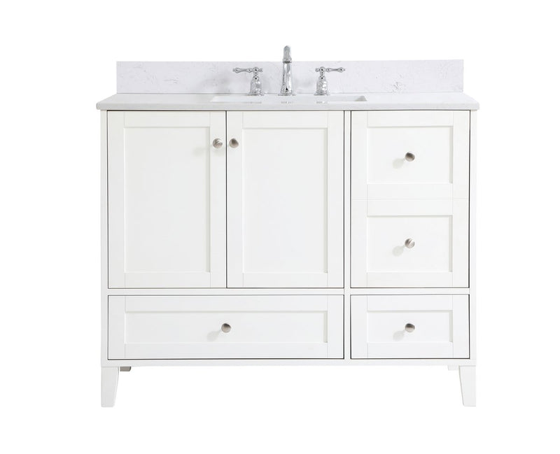 While unassuming, this 42" vanity in a white finish sure knows how to redefine luxury. The sleek brushed nickel knobs adorn the double cabinet doors and 3 drawers which allow you to store your bathroom toiletries and necessities. Standing strong on oblique legs and dressed with a Calacatta quartz countertop, this vanity will surely create beauty and casual elegance in your bathroom or powder room. Comes with a matching backsplash to complete the look and protects your wall.