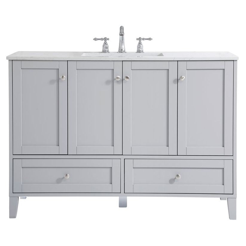 While unassuming, this 48" vanity in a grey finish sure knows how to redefine luxury. The sleek brushed nickel knobs adorn the 4 cabinet doors and 2 bottom drawers which allow you to store your bathroom toiletries and necessities. Standing strong on oblique legs and dressed with a Calacatta quartz countertop, this vanity will surely create beauty and casual elegance in your bathroom or powder room.