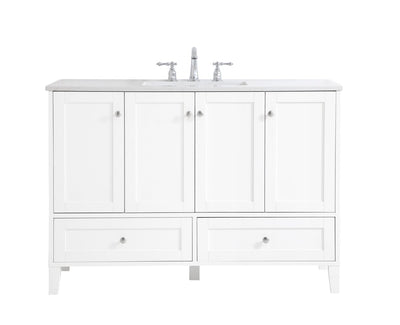 While unassuming, this 48" vanity in a white finish sure knows how to redefine luxury. The sleek brushed nickel knobs adorn the 4 cabinet doors and 2 bottom drawers which allow you to store your bathroom toiletries and necessities. Standing strong on oblique legs and dressed with a Calacatta quartz countertop, this vanity will surely create beauty and casual elegance in your bathroom or powder room.