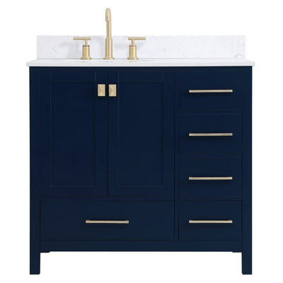Never compromise beauty--the Irene collection stunning vanity in a blue finish will add lovely sophistication and complement any bathroom or powder room, while utilizing its charm and function to provide you with ample storage spaces. Satin gold pulls gently adorn the minimalist cabinet doors and drawers at the base, allowing for you to store away your bathroom essentials. The Carrara white marble countertop, porcelain undermount sink, dignified subtle engravings on the side edges, and squared legs all come together to create contemporary beauty. Work with your space, and design a beautiful room, no matter the size. Comes with a matching backsplash to complete the look and protects your wall.