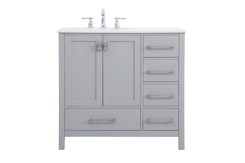 Never compromise beauty--the Irene collection stunning vanity in a gray finish will add lovely sophistication and complement any bathroom or powder room, while utilizing its charm and function to provide you with ample storage spaces. Brushed nickel pulls gently adorn the minimalist cabinet doors and drawers at the base, allowing for you to store away your bathroom essentials. The calcatta quartz countertop, porcelain undermount sink, dignified subtle engravings on the side edges, and squared legs all come together to create contemporary beauty. Work with your space, and design a beautiful room, no matter the size.