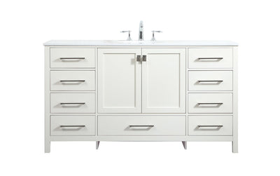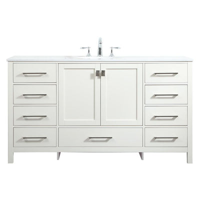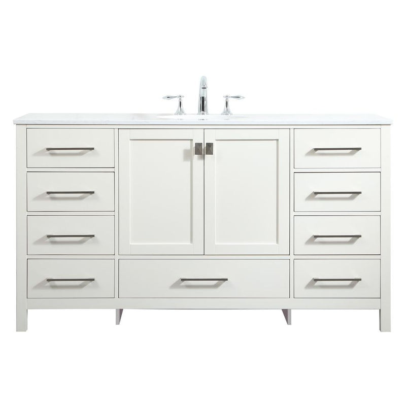 Never compromise beauty--the Irene collection stunning vanity in this finish will add lovely sophistication and complement any bathroom or powder room, while utilizing its charm and function to provide you with ample storage spaces. Brushed nickel pulls gently adorn the minimalist cabinet doors and drawers at the base, allowing for you to store away your bathroom essentials. The calcatta quartz countertop, porcelain undermount sink, dignified subtle engravings on the side edges, and squared legs all come together to create contemporary beauty. Work with your space, and design a beautiful room, no matter the size.