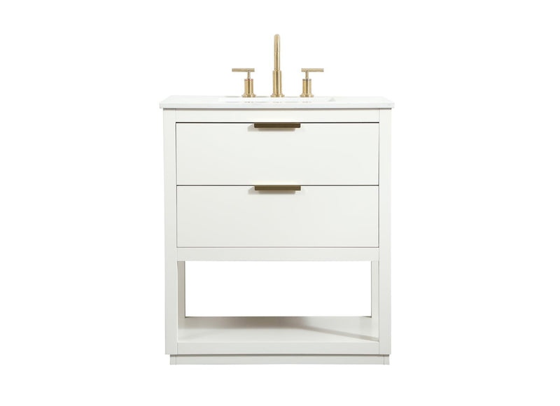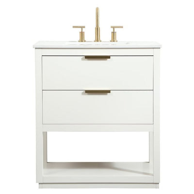 Live in modern comfort with this 30" white finish vanity. Dressed in a white and sleek gold metal hardware, its contemporary style will have your bathroom or powder room elevated in modern sophistication. The open shelf at the base and two drawers reveal ample storage space for your bathroom essentials and miscellany. Clean lines create its own visual interest, adding trendy looks to your already chic room.
