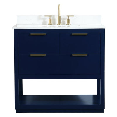 Live in modern comfort with this 36" blue finish vanity. Dressed in a blue and sleek gold metal hardware, its contemporary style will have your bathroom or powder room elevated in modern sophistication. The open shelf at the base and four drawers reveal ample storage space for your bathroom essentials and miscellany. Clean lines create its own visual interest, adding trendy looks to your already chic room. Comes with a matching backsplash to protect your walls.