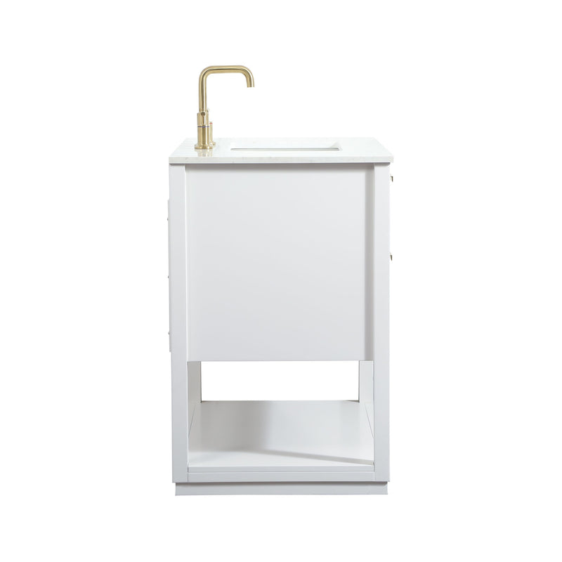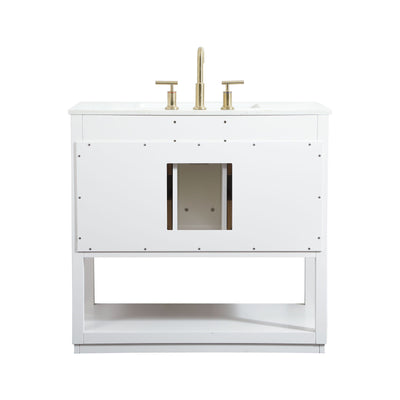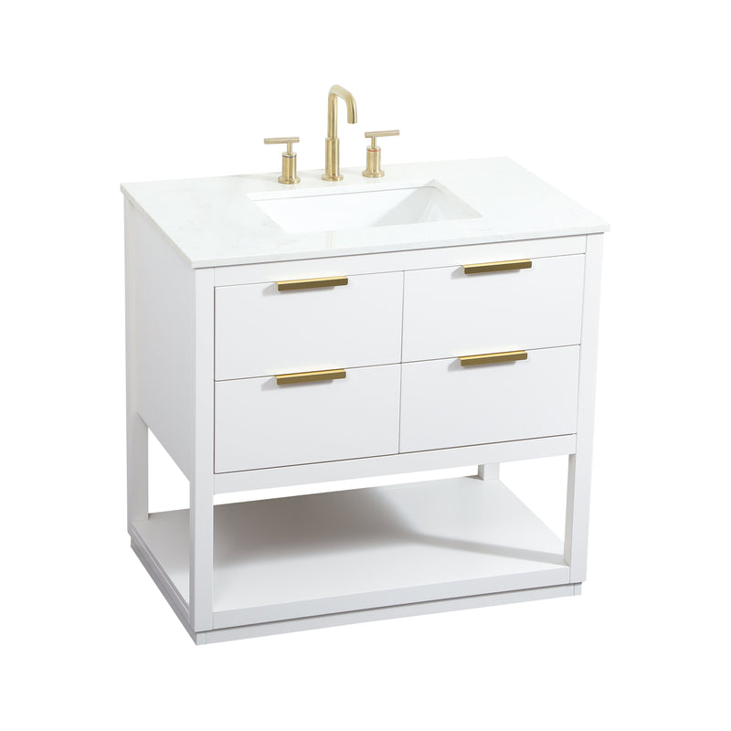 Live in modern comfort with this 36" white finish vanity. Dressed in a white and sleek gold metal hardware, its contemporary style will have your bathroom or powder room elevated in modern sophistication. The open shelf at the base and four drawers reveal ample storage space for your bathroom essentials and miscellany. Clean lines create its own visual interest, adding trendy looks to your already chic room.