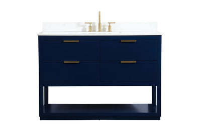 Live in modern comfort with this 48" blue finish vanity. Dressed in a blue and sleek gold metal hardware, its contemporary style will have your bathroom or powder room elevated in modern sophistication. The open shelf at the base and four drawers reveal ample storage space for your bathroom essentials and miscellany. Clean lines create its own visual interest, adding trendy looks to your already chic room. Comes with a matching backsplash to protect your walls.