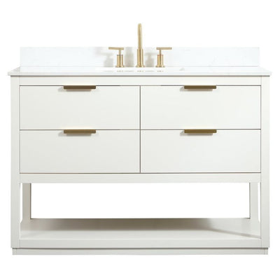 Live in modern comfort with this 48" white finish vanity. Dressed in a white and sleek gold metal hardware, its contemporary style will have your bathroom or powder room elevated in modern sophistication. The open shelf at the base and four drawers reveal ample storage space for your bathroom essentials and miscellany. Clean lines create its own visual interest, adding trendy looks to your already chic room. Comes with a matching backsplash to protect your walls.