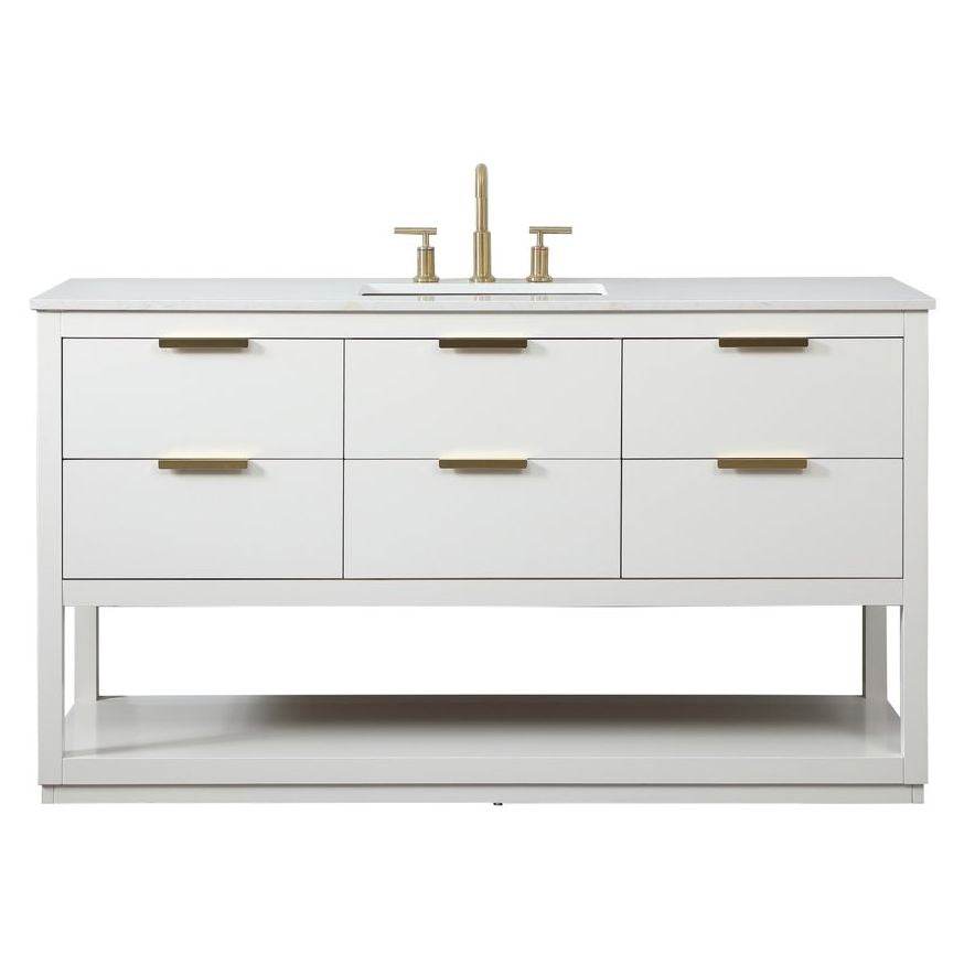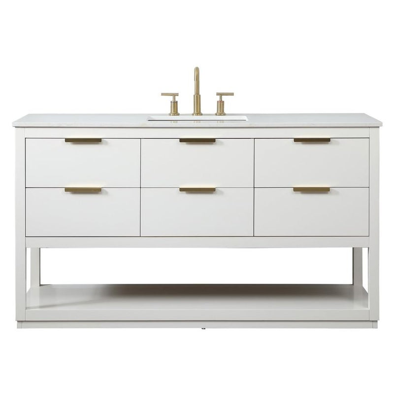 Live in modern comfort with this 60" white finish vanity. Dressed in a white and sleek gold metal hardware, its contemporary style will have your bathroom or powder room elevated in modern sophistication. The open shelf at the base and five drawers reveal ample storage space for your bathroom essentials and miscellany. Clean lines create its own visual interest, adding trendy looks to your already chic room.