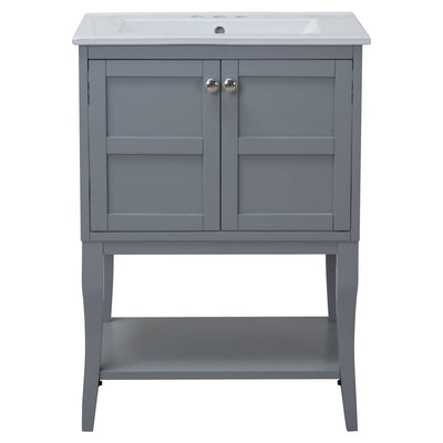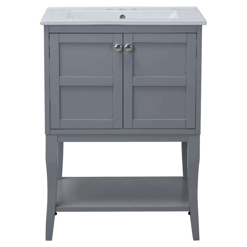 Designed with simple beauty and clean lines in mind , the Mason vanity will surely bring a unique flair to the modern day guest or office bathroom. Its transitional design features 2 framed doors with soft close function and an open shelf for your additional bathroom essential, topped with a modern white porcelain counter top with an integrated sink, which ensure non stain, scratch resistance and maintenance free use. the cabinet is painted in soft grey, accented with round stainless steel door knobs, and build by solid wood frame, with graciously curved legs. FEATURES: *Mason collection *Porcelain top with integrated sink *Measurements: W24xD18xH34" *Cabinet finish: soft grey *4" spread ready to install faucet hole *2 doors and 1 shelf *Door knob finish: chrome *Build with solid wood and engineered wood. PRODUCTS DETAIL: *Top material: porcelain *Sink: porcelain *Base material:wood *Faucet: not included *Door included: 2 *Shelf: 1 *installation: required.