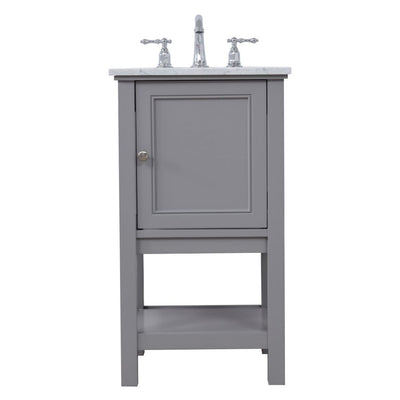 Create a refined and relaxing bath space with this contemporary design vanity, presenting its simplicity and clean straight lines in a minimalist appeal. The 18" soft-grey vanity , crafted of solid poplar wood,provides ample storage within its soft-close cabinet door and open shelf base, accentuated with chrome hardware. Rounding out the design is a luxurious Itallian Carrara white marble with a white porcelain under-mount oval sink.