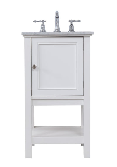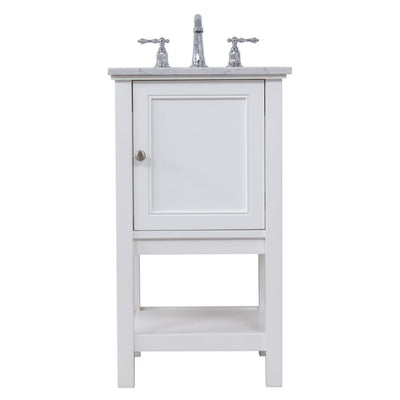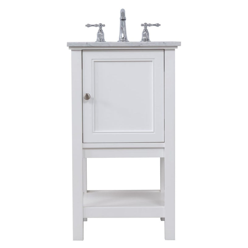 Create a refined and relaxing bath space with this contemporary design vanity, presenting its simplicity and clean straight lines in a minimalist appeal. The 18" white vanity, crafted of soild poplar wood, provides ample storage within its soft-close cabinet door and open shelf base, accentuated with chrome hardware. Rounding out the design is a luxurious Itallian Carrara white marble with a white porcelain under-mount oval sink.