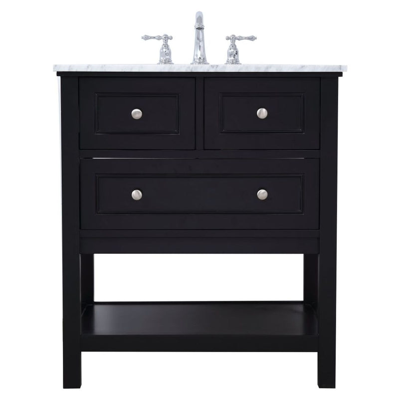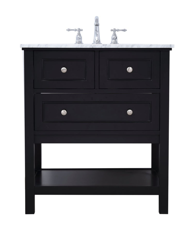 Create a refined and relaxing bath space with this contemporary design vanity, presenting its simplicity and clean straight lines in a minimalist appeal. The 30" black vanity, crafted of solid poplar wood, provides ample storage within its soft-close drawer and open shelf base, accentuate with chrome hardware. Rounding out the design is a luxurious Itallian Carrara white marble with a white porcelain under-mount oval sink.