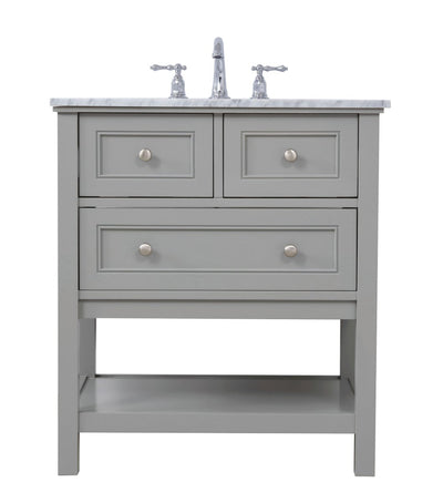 Create a refined and relaxing bath space with this contemporary design vanity, presenting its simplicity and clean straight lines in a minimalist appeal. The 30" soft-grey vanity, crafted of solid poplar wood, provides ample storage within its soft-close drawer and open shelf base, accentuated with chrome hardware. Rounding out the design is a luxurious Itallian Carrara white marble with a white porcelain under-mount oval sink.