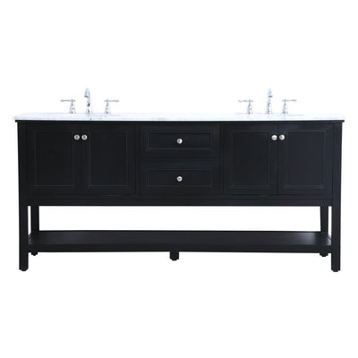 Create a refined and relaxing bath space with this contemporary design vanity, presenting its simplicity and clean straight lines in a minimalist appeal. This 60" freestanding vanity, crafted of solid poplar wood and painted in black, provides ample storage within its double center drawers and 4 side doors, all equipped with soft closing mechanism and accentuated with gleaming chrome hardware. Rounding out the design is a luxurious Itallian Carrara white marble countertop and double white porcelain under-mount oval sink.