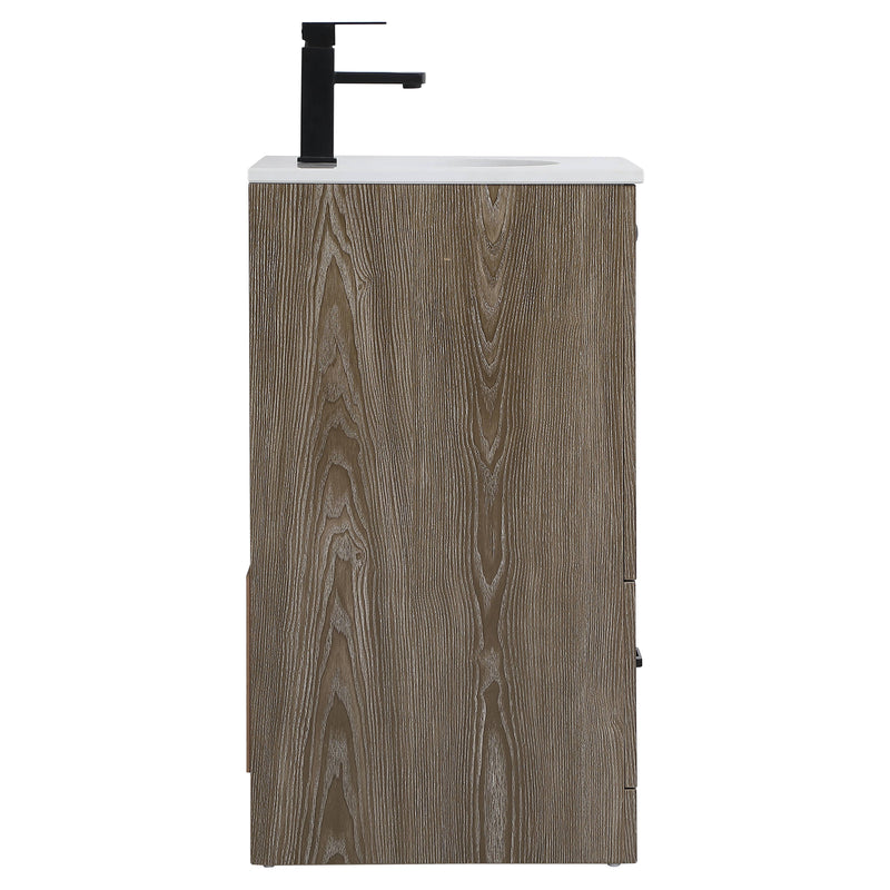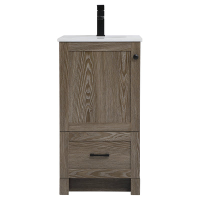 Delve into a world of minimalistic fashion and contemporary styling with this farmhouse 18" vanity. The clean faux lines anchors the weathered design. Black handle adorns the two doors hiding the base of the integrated porcelain sink while the bottom drawer allows you to store your bathroom necessities and toiletries. The compact size makes it the perfect vanity for any bathroom or powder room, regardless of size.