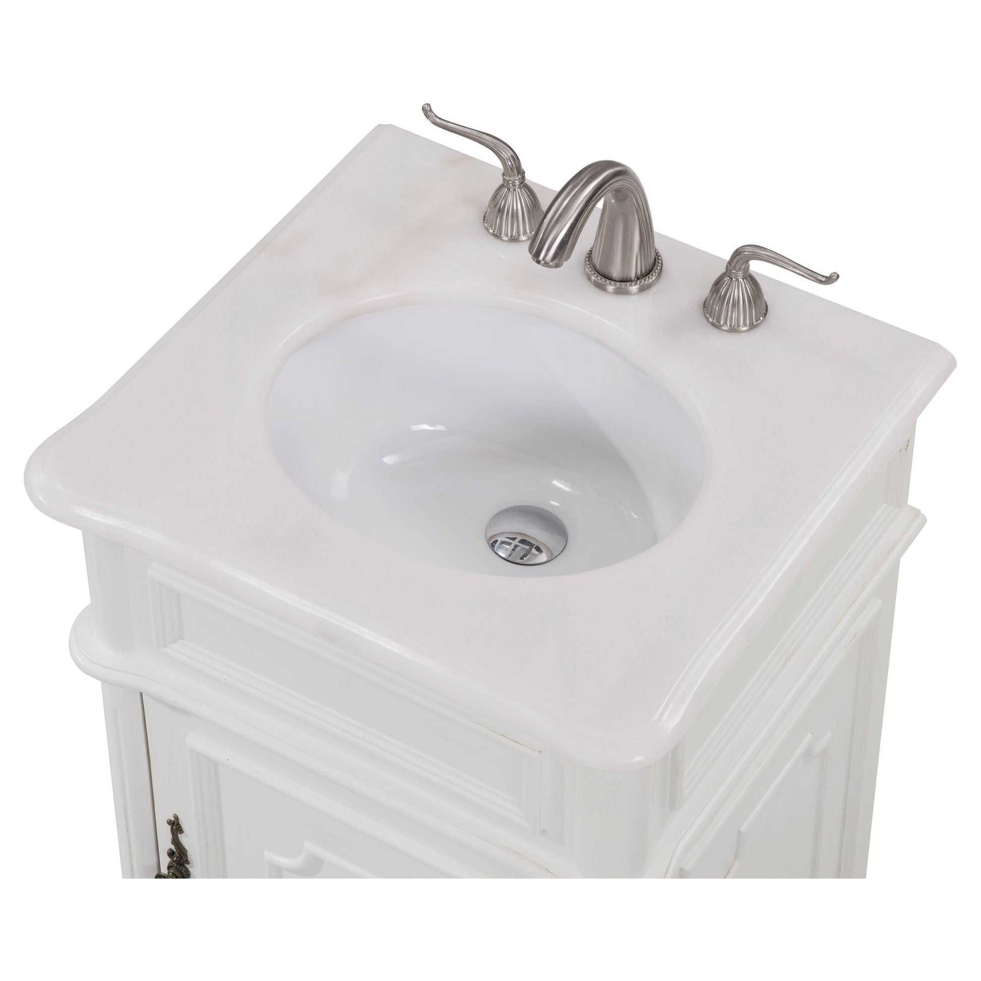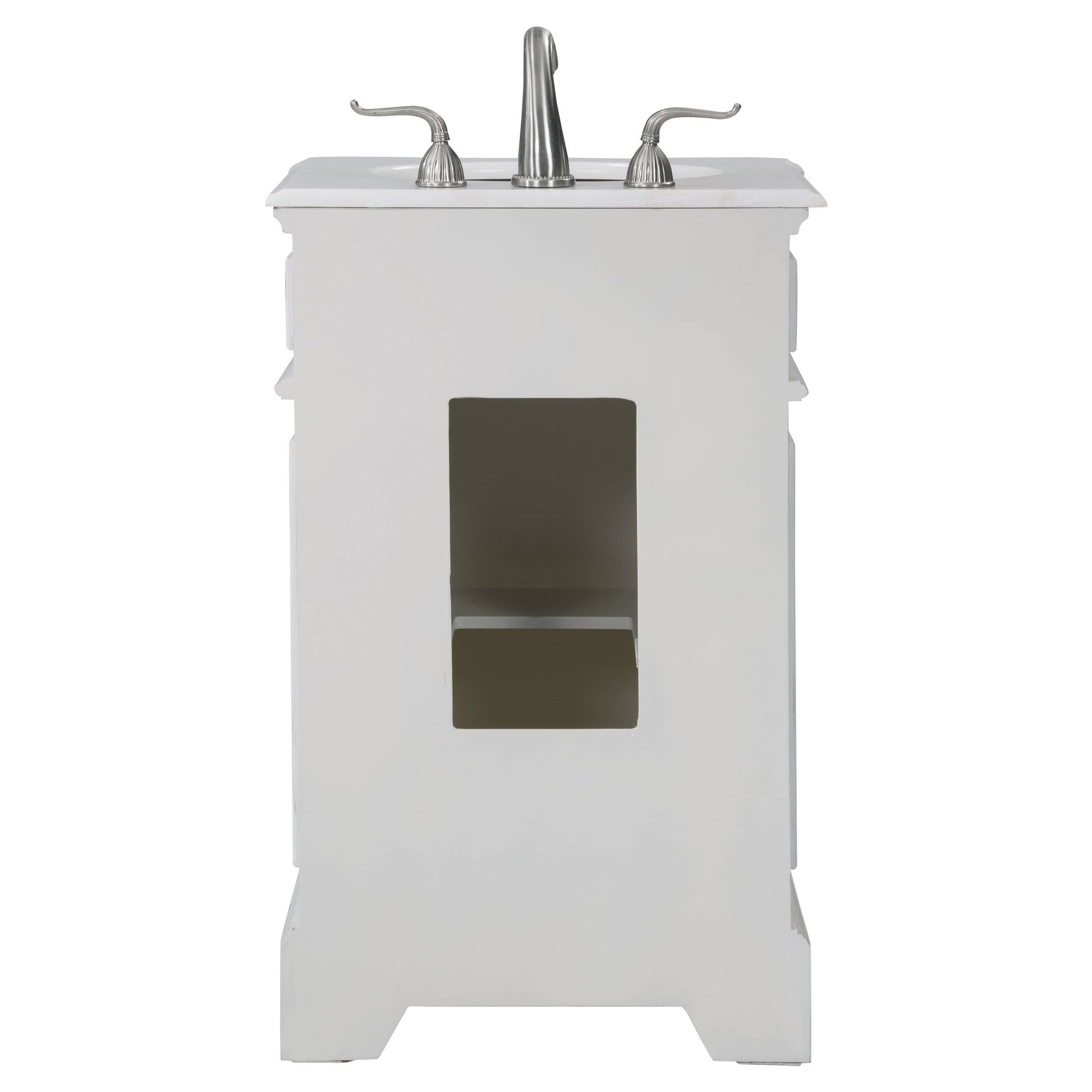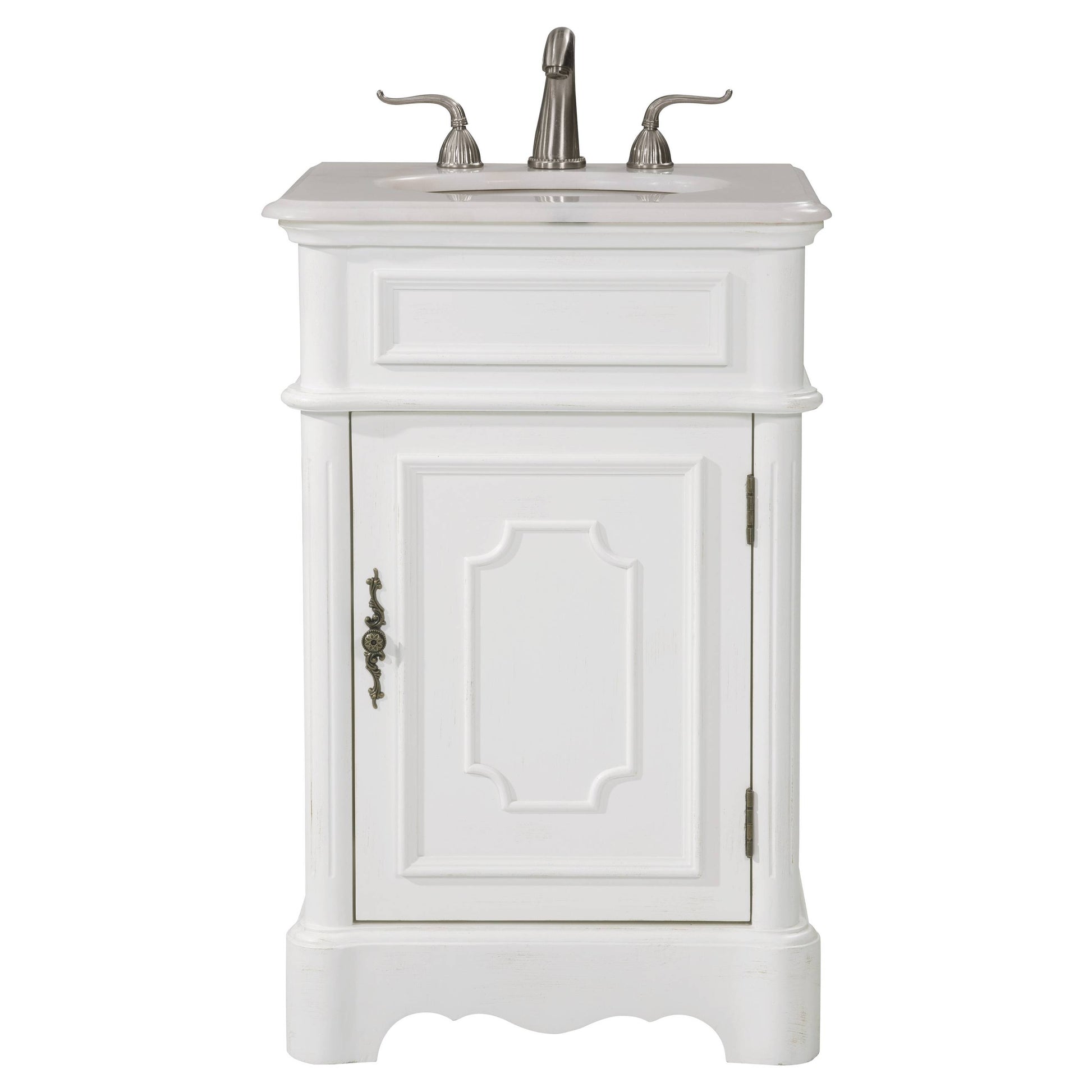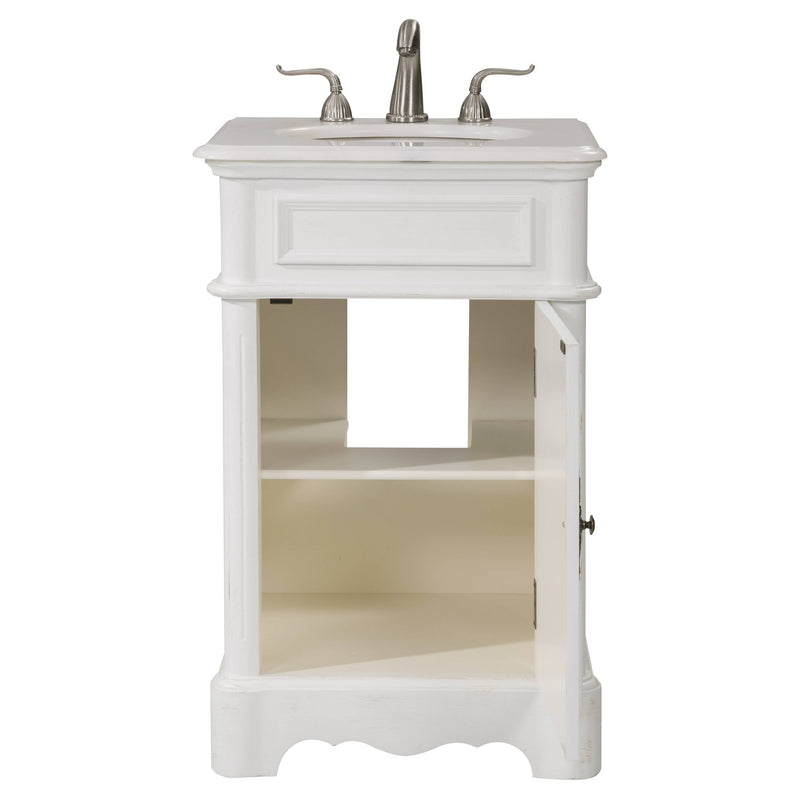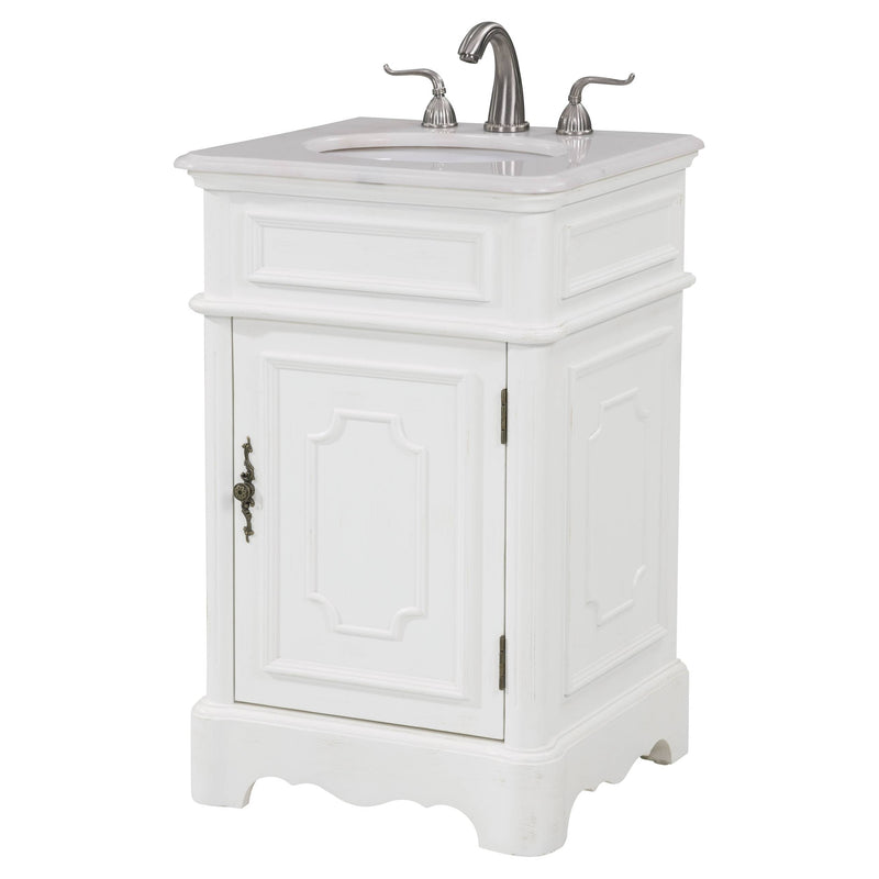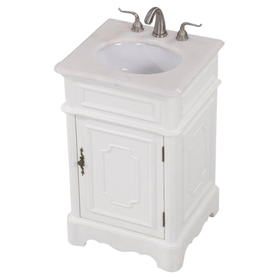 This Retro collection vanity by Elegant Lighting redefine the mid century chic, are designed to please. Top with an all natural natural white marble, under mount white oval porcelain sink, over a white curvy cabinet with a single door and antique bronze hardware. Inside the door yield spacious open storage with 1 shelf. "FEATURES: "*Retro collection "*Measurements:W21xD19xH33" *All natural natural white marble counter *Cabinet finish: white "*Under mount white oval porcelain sink *Made in solid wood and engineer wood *Number of doors: 1 *Hardware finish: antique bronze *inside and back finish: white *Free standing *accommodates 1 sink *Pre-drill faucet holes, 8" spread. "PRODUCT DETAILS: *Top materials: marble *Sink included: yes *Faucet included: no *Installation required: no *Assembly required: no *Base materials: wood *Mounting: free standing *Doors included: yes *Shelf: 1.