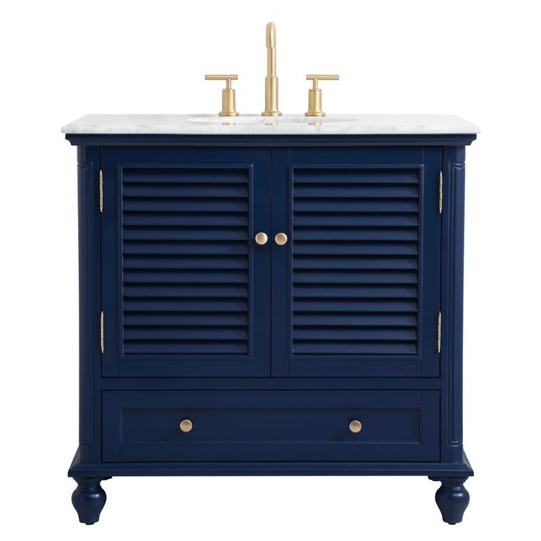 The Rhodes collection compact vanity will add lovely sophistication and complement any small bathroom or powder room, while utilizing its charm and function to provide you with ample storage spaces. Metal round knobs gently adorn the shuttered cabinet door and drawer at the base, allowing for you to store away your bathroom essentials. The Carrara white marble countertop, porcelain undermount sink, dignified subtle engravings on the side edges, and rounded legs all come together to create contemporary beauty. Work with your space, and design a beautiful room, no matter the size.