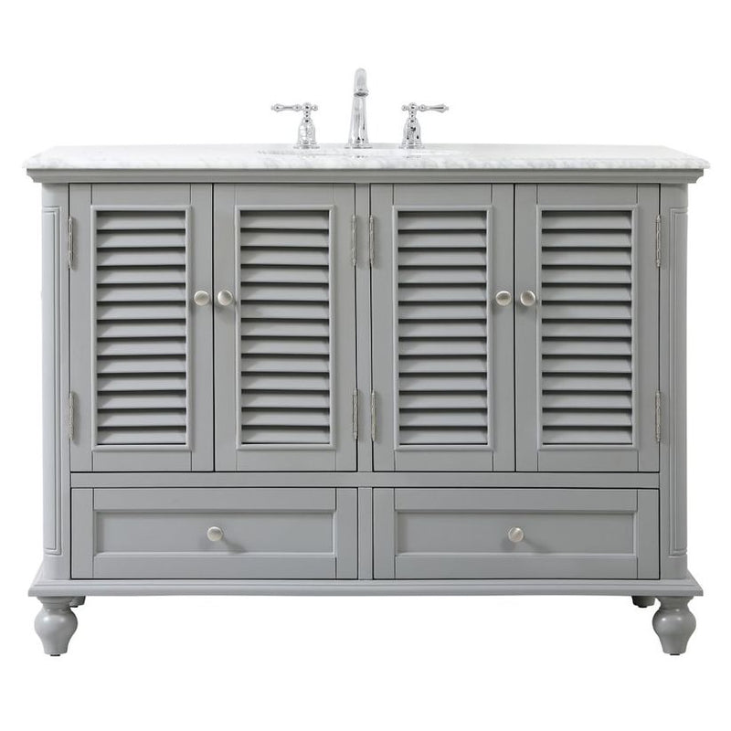 The Rhodes collection compact vanity will add lovely sophistication and complement any small bathroom or powder room, while utilizing its charm and function to provide you with ample storage spaces. Metal round knobs gently adorn the shuttered cabinet door and drawer at the base, allowing for you to store away your bathroom essentials. The Carrara white marble countertop, porcelain undermount sink, dignified subtle engravings on the side edges, and rounded legs all come together to create contemporary beauty. Work with your space, and design a beautiful room, no matter the size.