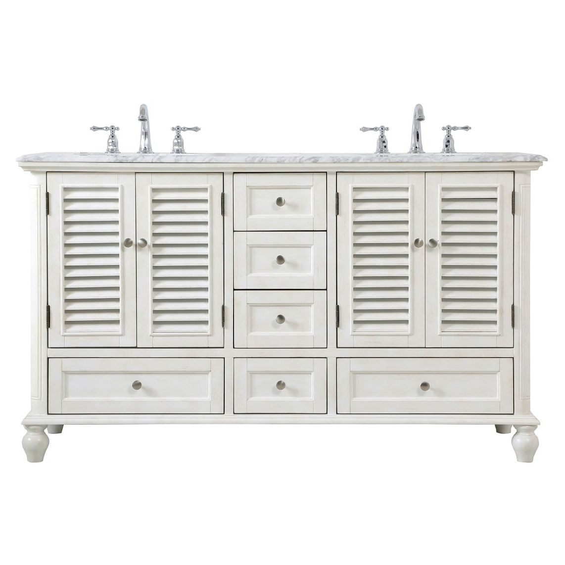 - Distressed antique white finish with a luxurious carrara white marble vanity top