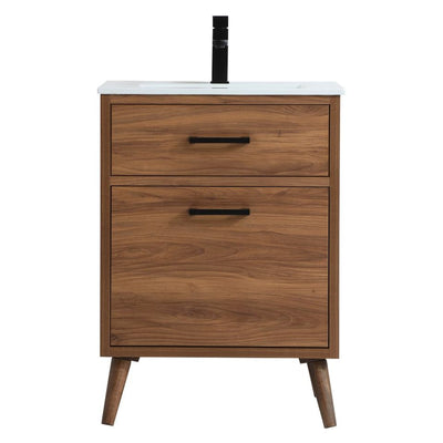 Delve into a world of minimalistic fashion and contemporary styling with this midcentury modern 24" vanity. The clean lines anchors the design, while the oblique tapered cylinder legs add subtle interest. A black handle adorns the top fake drawer hiding the base of the integrated porcelain sink while another one allows you to pull the bottom drawer out, letting you store your bathroom necessities and toiletries. The compact size makes it the perfect vanity for any bathroom or powder room, regardless of size.