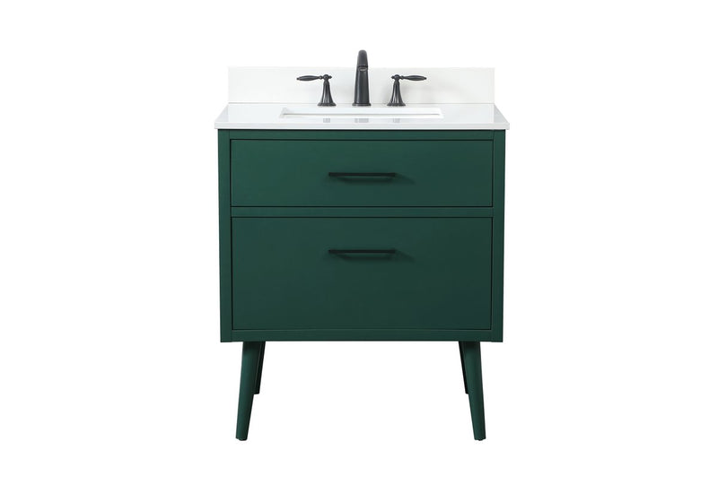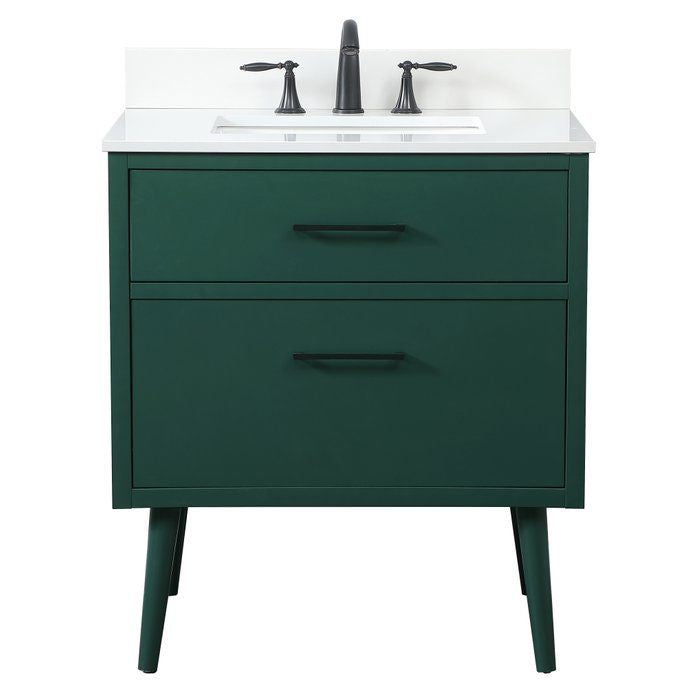 Delve into a world of minimalistic fashion and contemporary styling with this midcentury modern 30" vanity. The clean lines anchors the design, while the oblique tapered cylinder legs add subtle interest. However, the artful juxtaposition between the blue and white top creates a blend of bright modernity and classical traditions. A gold handle adorns the top fake drawer hiding the base of the integrated porcelain sink while another one allows you to pull the bottom drawer out, letting you store your bathroom necessities and toiletries. The compact size makes it the perfect vanity for any bathroom or powder room, regardless of size. Comes with a matching backsplash to complete the look and protects your wall.