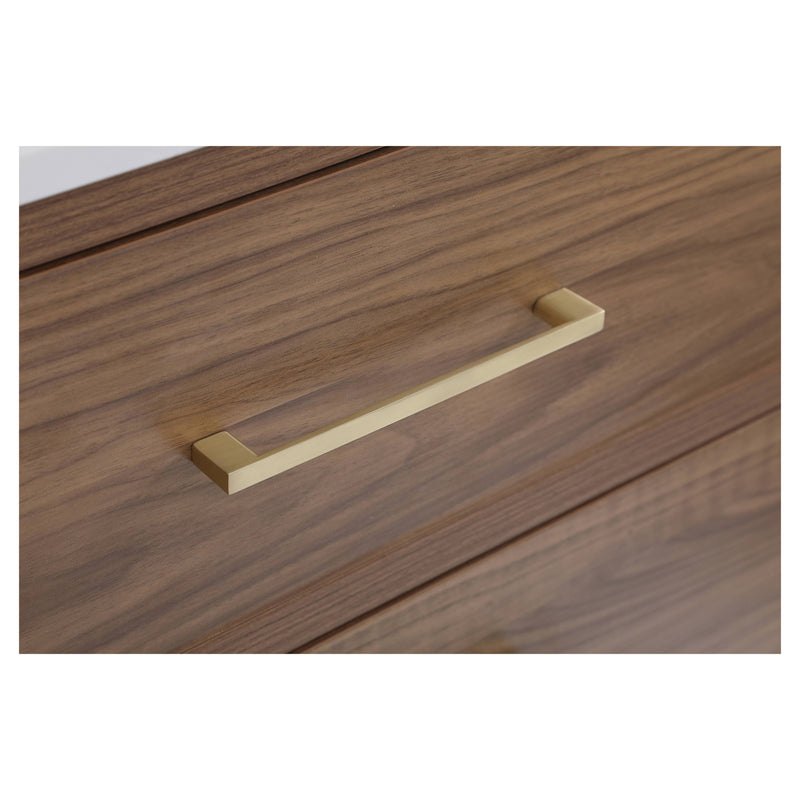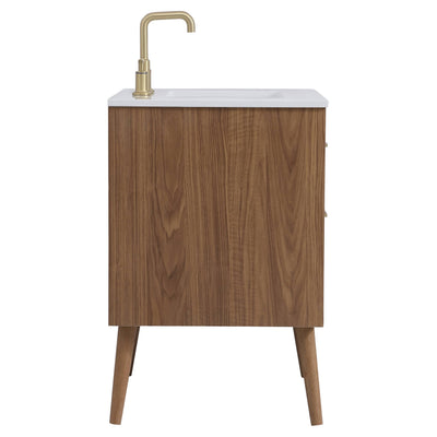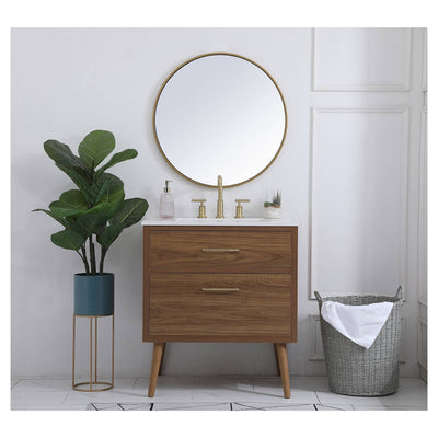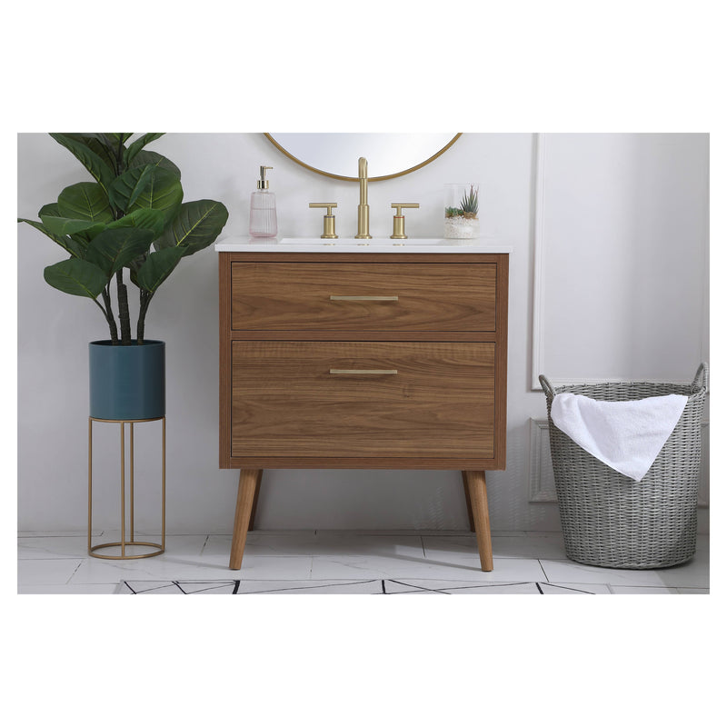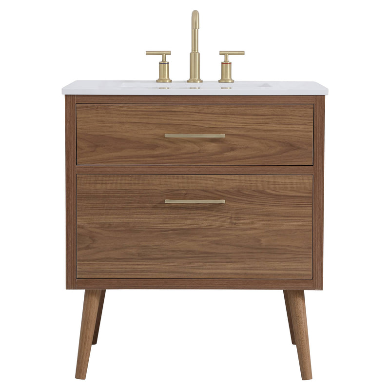 Delve into a world of minimalistic fashion and contemporary styling with this midcentury modern 30" vanity. The clean lines anchors the design, while the oblique tapered cylinder legs add subtle interest. However, the artful juxtaposition between the walnut brown and matte white creates a blend of bright modernity and classical traditions. A gold handle adorns the top fake drawer hiding the base of the integrated porcelain sink while another one allows you to pull the bottom drawer out, letting you store your bathroom necessities and toiletries. The compact size makes it the perfect vanity for any bathroom or powder room, regardless of size.