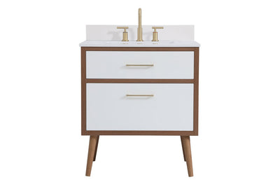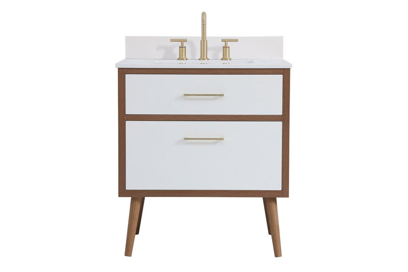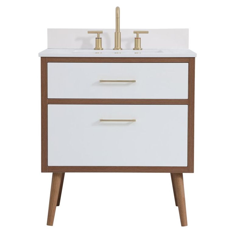 Delve into a world of minimalistic fashion and contemporary styling with this midcentury modern 30" vanity. The clean lines anchors the design, while the oblique tapered cylinder legs add subtle interest. However, the artful juxtaposition between the walnut brown and matte white creates a blend of bright modernity and classical traditions. A gold handle adorns the top fake drawer hiding the base of the integrated porcelain sink while another one allows you to pull the bottom drawer out, letting you store your bathroom necessities and toiletries. The compact size makes it the perfect vanity for any bathroom or powder room, regardless of size. Comes with a matching backsplash to complete the look and protects your wall.